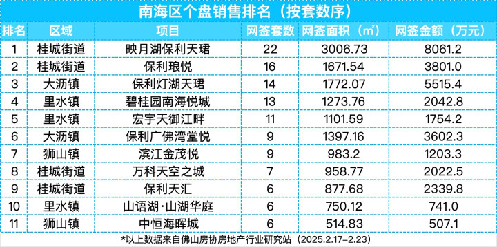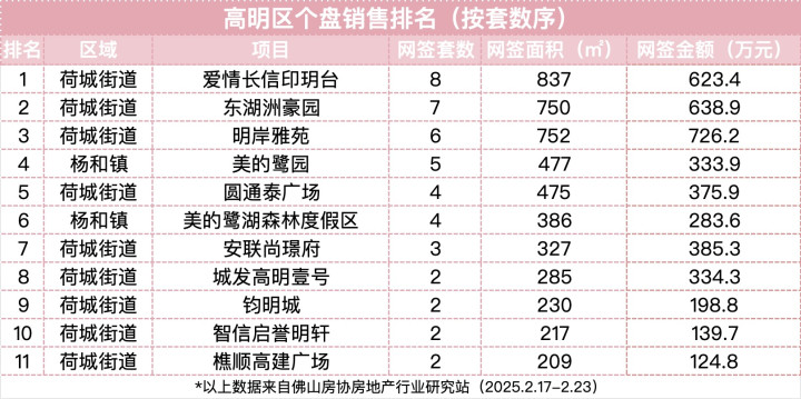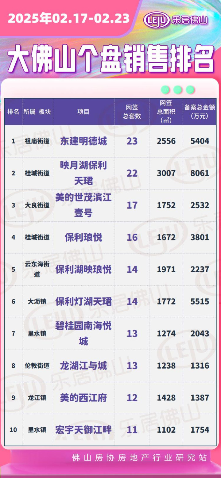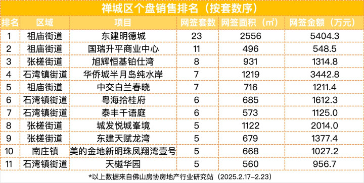 根据佛山房协房地产行业研究站数据显示,上周位于禅城祖庙的东建明德城以23套的网签量稳居一周榜首,其余位列前三的还有南海桂城的映月湖保利天珺和顺德大良的美的世茂滨江壹号。